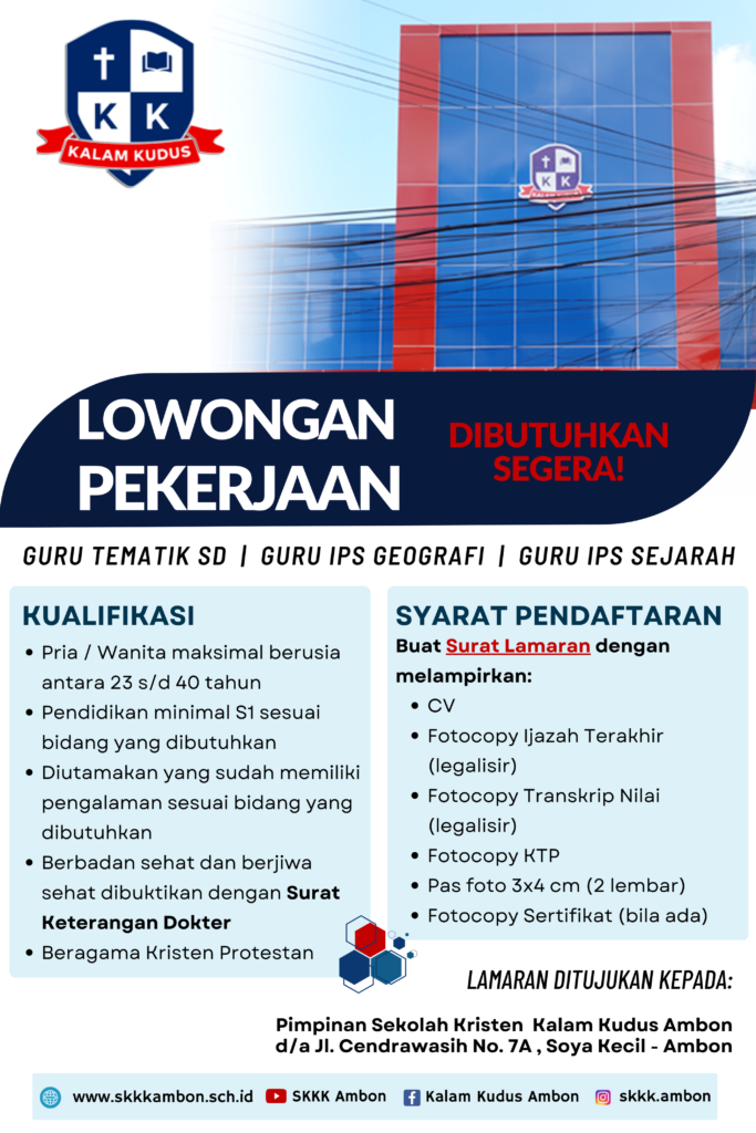 Sekolah Kristen Kalam Kudus Ambon mengundang anda bergabung untuk posisi: